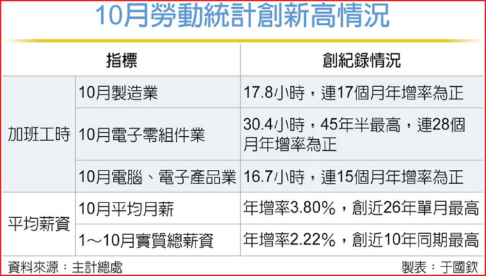 主計總處10日公布10月薪資統計,受惠於AI及高效能運算需求帶動出口,10月平均月薪(經常性薪資)年增率3.80%創近26年單月最高,電子零組件業加班工時逾30小時也創45年半最高,惟部分傳產的勞動狀況仍受到美國關稅政策的衝擊。