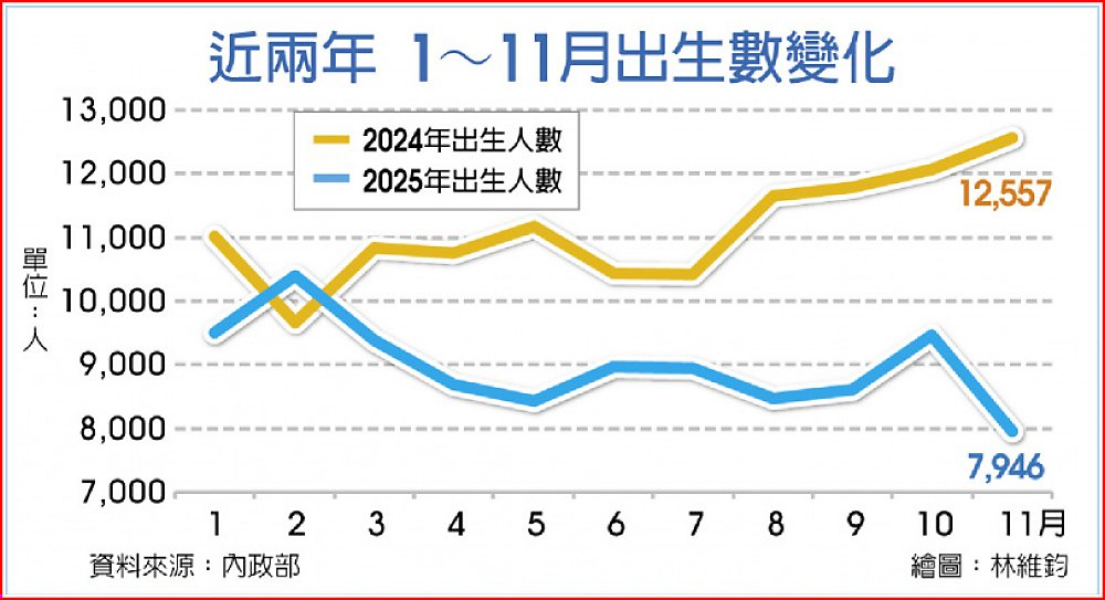 內政部發布最新人口統計,今年11月出生僅7,946人、年減逾36.7%,為史上單月最低,11月死亡人數近1.5萬人,連續59個月「生不如死」,全國總人口已連23月下跌至2,330萬人,平均每月減少近5千人。2024年全年有13.4萬人創新低,但2025年1至11月累計出生人數只有98,785人,評估今年全年新生兒將不到11萬人。