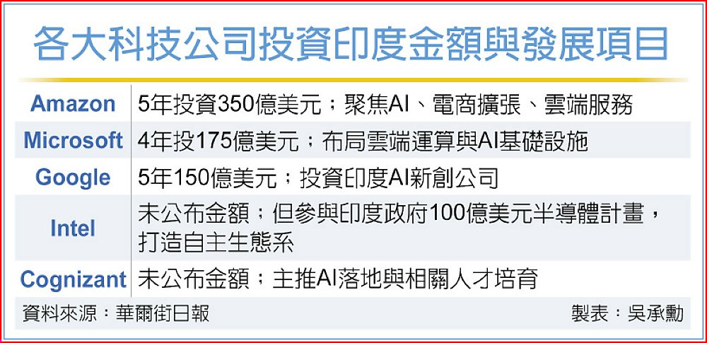 亞馬遜10日承諾,未來五年內在印度投資超過350億美元,用於雲端運算及AI領域。加上微軟9日宣布將在印度投資超過175億美元,印度短短兩日就湧進500億美元投資,顯示各大科技公司爭相於此布局AI市場。