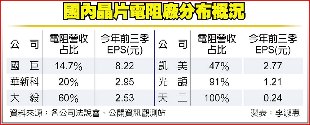 目前國內主要晶片電阻廠商包括國巨(2327)、華新科(2492)、大毅(2478)、凱美(2375)、天二(6834)、光頡(3624)等,其中國巨為全球晶片電阻龍頭,全球市占超過三成,相關產品占其營收約14.7%。由於晶片電阻標準化程度相對較高,陸資廠的產能調整格外受到市場關注。