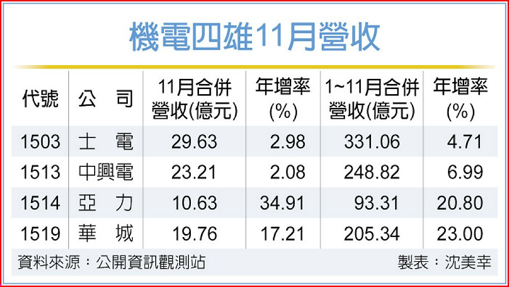 台電強韌電網計畫持續釋單,外銷或海外事業也成長,士電(1503)、中興電(1513)、亞力(1514)及華城(1519)等機電四雄,11月及前11月營收全面改寫同期新高。台電對變壓器等重電設備需求殷切,要求士電及華城得優先供貨。