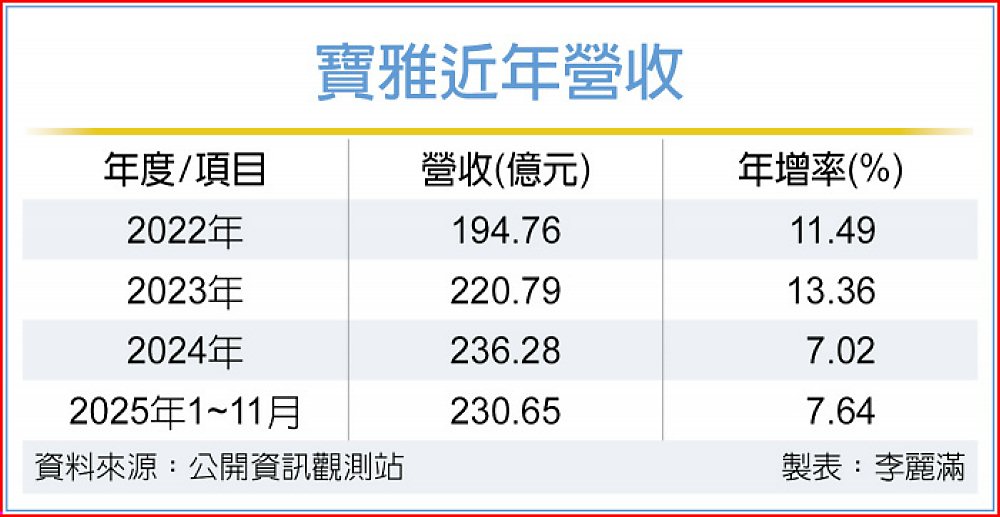 百貨股股王寶雅(5904)受惠展店與美妝店旺季效應帶動,自結11月營收21.76億元、年增14.27%,前11月營收230.65億元、年增7.64%,單月與累計營收均創同期新高。