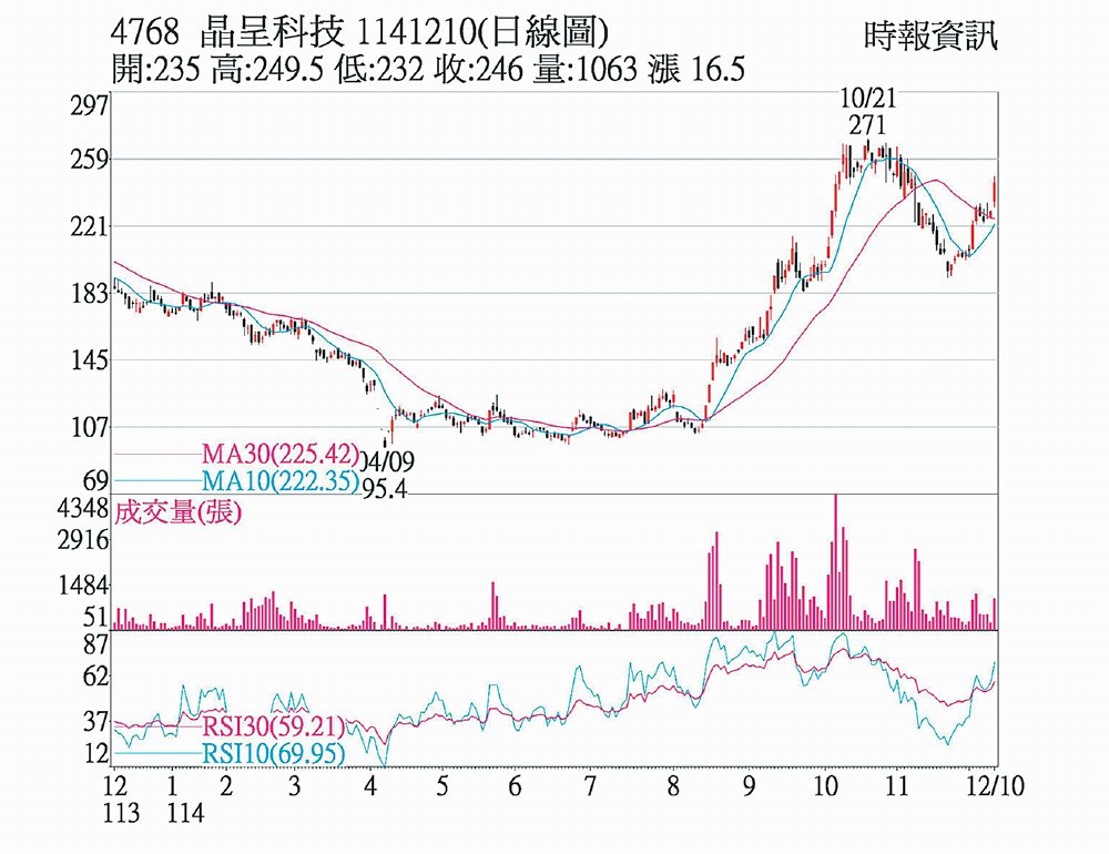 晶呈科(4768)因11月營收明顯躍進,10日股價隨特定買盤進駐拉抬,強勢攀揚,終場收246元、漲幅7.19%,成交量比前一日倍增至1,040張,其中外資、自營商買超76、34張,投信賣超42張。股價連三漲,合計漲幅9.82%,突破232元壓力,站上所有均線之上,多空量能強勢向上。