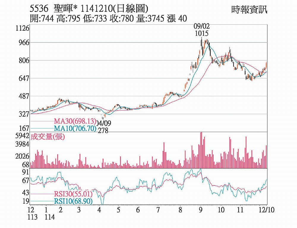 聖輝*(5536)10日一開盤走跌,多次在平盤上下震盪,後因土洋法人對作,上午9時39分,股價從平盤走升,並震盪走高,上午10時57分來到最高價795元,隨後股價走弱,終場收780元,漲幅5.41%,成交量3,745張。