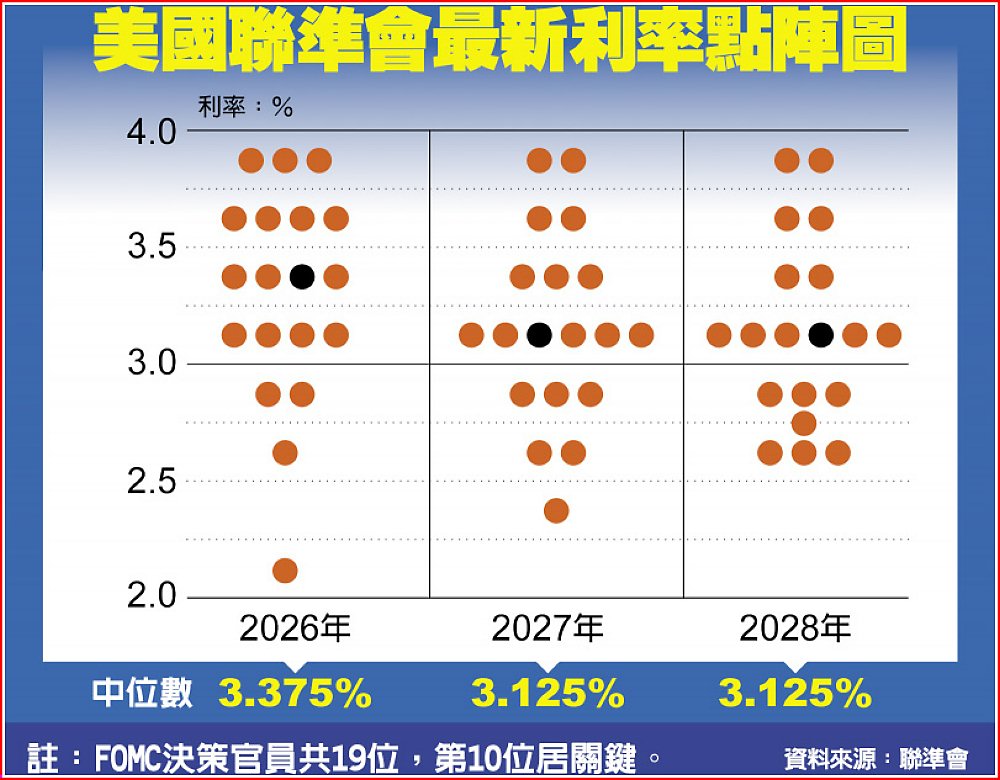 Fed會後同時公布預測利率的點陣圖,根據19位決策官員的利率預測中位數顯示,2026和2027年將各降息1碼。其中7位官員主張2026年維持利率不動,4位認為降息1碼,4位認為降2碼,2位認為降3碼,1位認為降4碼,1位認為降6碼。