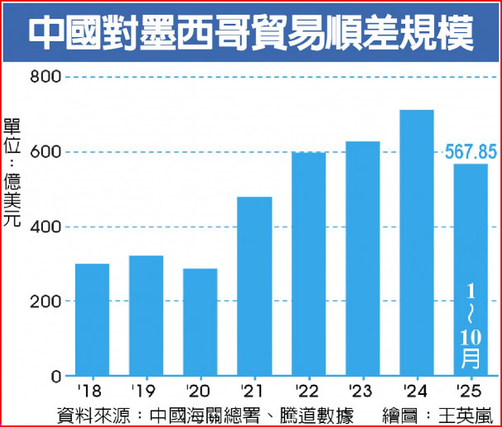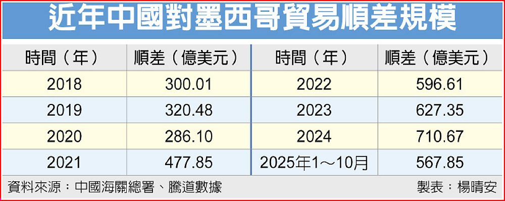 中國僅次於美國是墨西哥第二大貿易夥伴,近年貿易順差持續擴大。根據中國海關總署數據,2024年中國對墨西哥貿易順差突破710.67億美元,累計2025年前10月為567.85億美元。