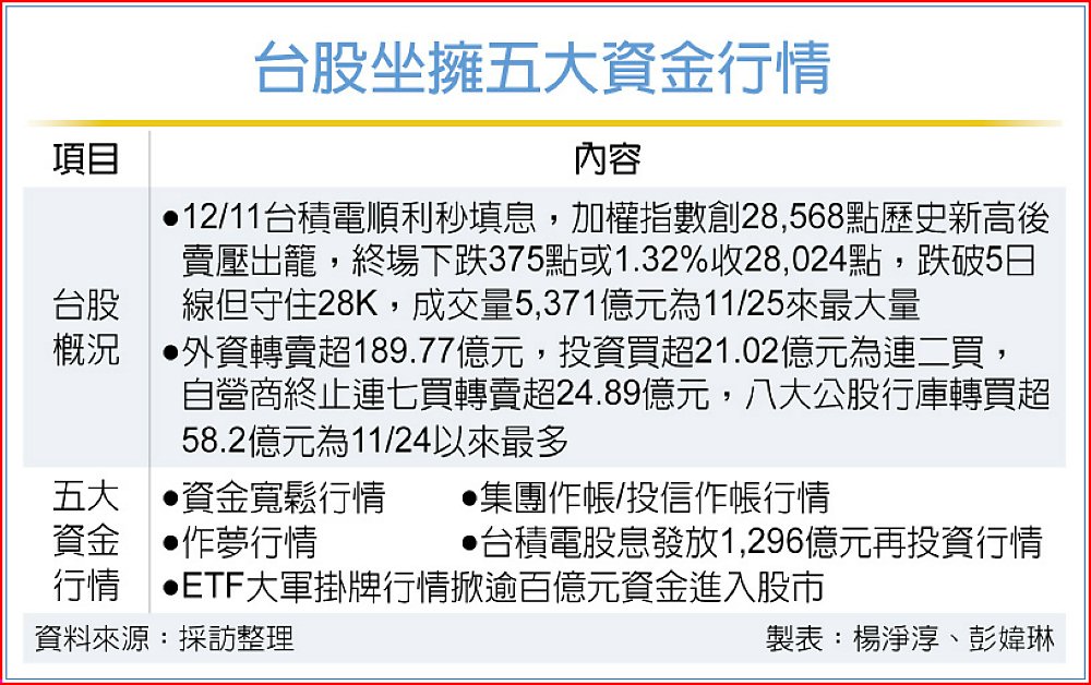 美國聯準會降息1碼利多,帶動台積電11日早盤順利上演秒填息、加權指數順勢上漲167點至28,568點創歷史新高,惟不敵甲骨文財報利空,導致獲利了結賣壓湧現,加權指數翻黑並一路走跌,終場下跌375點以幾近最低28,024點收盤,跌破5日線,成交量放大至11月25日以來最大5,371億元。