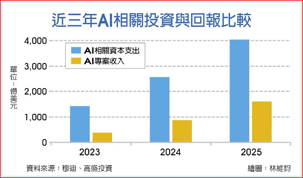 穆迪評級最新展望2026年經濟景氣,同時連續第二年發布人工智慧展望年度報告指出,基於資本支出遠超收入成長,2025年缺口高達2,450億美元,人們對人工智慧投資泡沫的擔憂日益加劇,如果這種情況持續到2026年,市場估值可能會出現回檔。