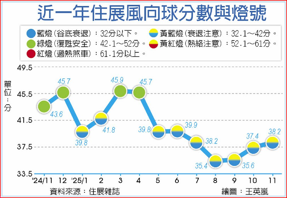 代表北台灣新建案市場概況的「住展風向球」,11月受到年底預售大案進場推升供給,但買氣並未同步提升,燈號仍維持衰退的黃藍燈。《住展雜誌》指出,年底新北市尚有數個百億元大案有機會推出,北台灣2025全年推案量有望低空飛過兆元關卡,但恐將是2018年以來的新低量。