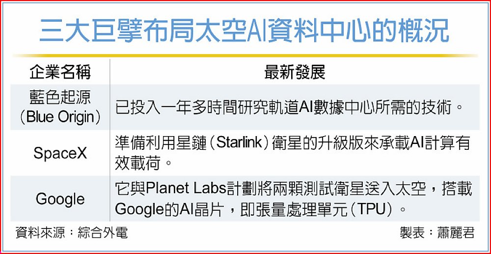 除了馬斯克與貝佐斯,其他科技公司也在積極探索太空資料中心的可能性。Google計劃2027年發射兩顆測試衛星,搭載自家AI晶片(TPU),以驗證衛星作為運算集群的可行性。IBM旗下紅帽公司也和Axiom Space合作,在今年8月發射資料運算原型。