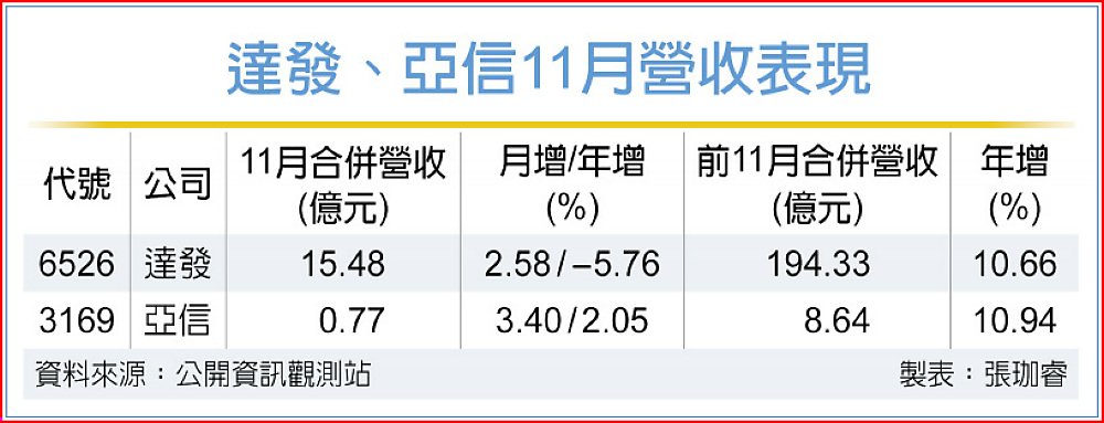 達發11月合併營收達15.48億元,月增2.58%、年減5.76%,累計前11月合併營收達194.33億元,年增10.66%,持續維持正成長動能。目前由藍牙音訊與寬頻網路兩大產品線驅動,達發藉由聯發科集團平台強化在歐洲與亞太的滲透率。