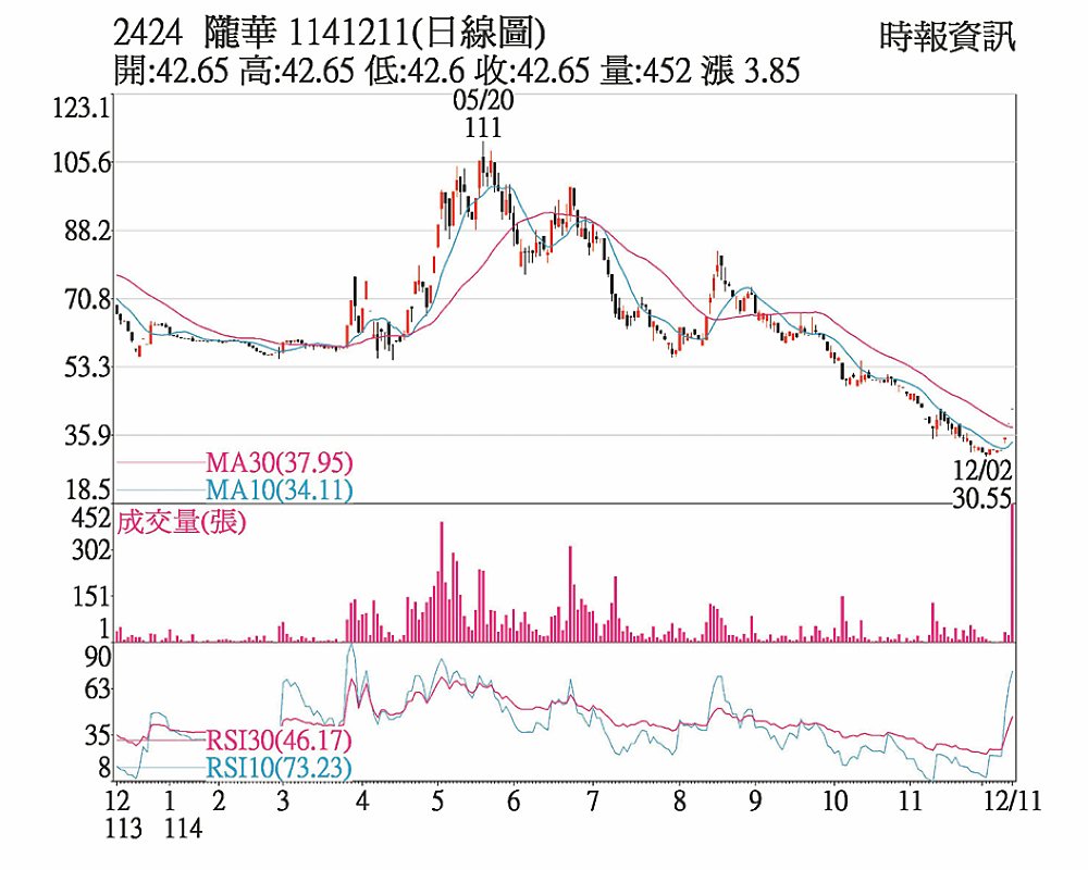 隴華(2424)去年來受全球網通市場景氣不佳,營運下滑,股價近期持續修正,12月初股價跌至波段新低30.55元之後,成功力守整數關卡,逢低買盤也適時進場,11日股價拉上漲停板,以42.65元收市,技術面上股價重新站回5日、10日及月線關卡,目前技術指標逐漸轉為偏多,短線上若能維持量增,並站穩在月線之上,後市有機會挑戰季線約46.2元位置。
