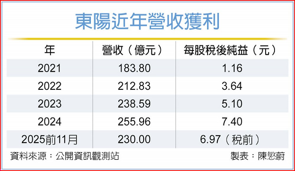 東陽11月營收22.18億元,創近七個月新高,在營收規模擴大帶動下,獲利表現同步增溫。東陽指出,今年4月以來,AM(售後維修)汽車零件市場雖持續受到關稅、匯率波動等不確定因素干擾,但進入第四季傳統旺季後,客戶需求熱度不減,下半年營運呈現「月月增長」態勢,顯示主力產品極具市場競爭力,成功在動盪的環境中獲得客戶買單。