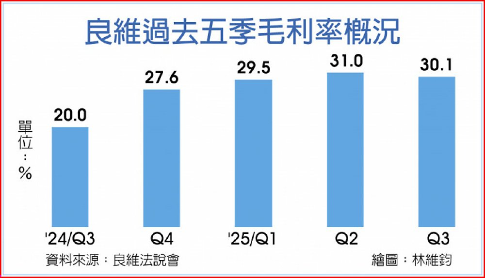 良維副總經理林文裕表示,公司自2003年便投入大電力電源線領域,早期以IBM為主要客戶,累積超過二十年實力,隨著AI運算對電力需求急速提升,大電力電源線需求自五年前開始明顯攀升。他指出,今年前三季資料中心與伺服器產品的營收比重已達36%,明顯高於去年的24%,累計前三季每股稅後純益6.2元,已經約當去年一整年獲利。