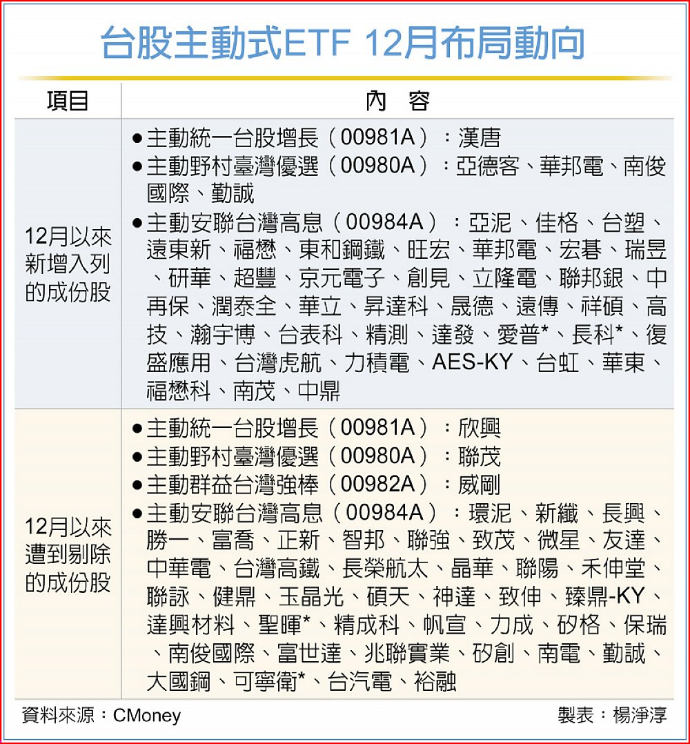 主動式ETF規模持續壯大,對於個股影響力也持續攀升,且成為市場判斷趨勢的重要風向球,而台股在12月11日再創歷史新高後翻黑,12日反彈收回28,198點,在加權指數自月初下探月線又反彈再刷歷史新高的過程中,主動式ETF經理人們也積極汰弱留強,其中,漢唐、亞德客、華邦電等紛紛獲得經理人新納入成份股名單中。