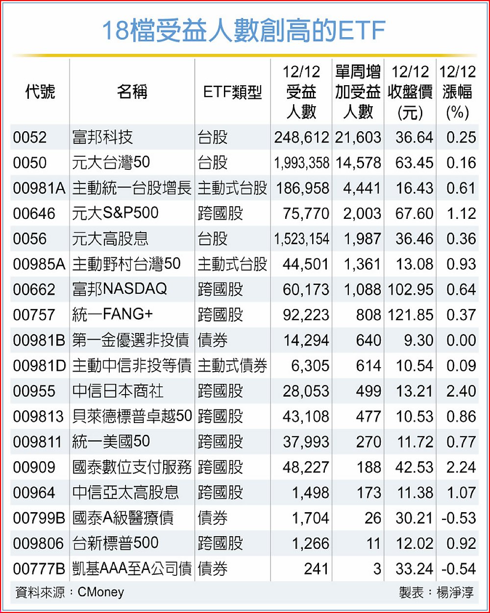 18檔受益人數創高的ETF中,富邦科技、元大台灣50兩檔今年已進行分割的老牌ETF單周更是用湧入萬人以上,而主動統一台股增長、元大S&P500、元大高股息、主動野村台灣50、富邦NASDAQ也單周增加超過千人以上加碼。而除了美股與台股以外,股票型還有中信日本商社、中信亞太高股息受益人數也創下新高,此外,本周創高的還有將於16日與18日除息的第一金優選非投債、主動中信非投等債、凱基AAA至A公司債等債券型ETF,獲得投資人湧進搶先卡位。