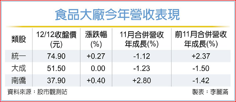 食品廠在第四季接連遭受非洲豬瘟、大宗物資價格下行與大陸市場內捲競爭加劇等諸多因素影響,包括統一、大成等接連兩個單月營收年減,南僑雖終結連六個月衰退,11月回神逆增2.80%,惟整體季營收看淡,由於馬年農曆春節落在2月,法人估2026年1月整體市況可回溫。