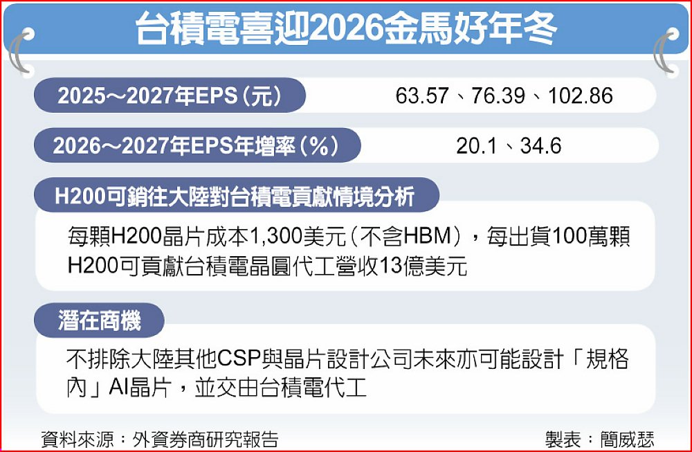 值得關注的是,就算不考慮大陸客戶會否接受H200,及美國將徵收25%稅率等條件,內外資研究機構原本就對台積電獲利動能信心滿滿。外資所做財務模型顯示,台積電2026年每股稅後純益(EPS)達76.39元,比今年的63.57元高出2成,隨AI持續蓬勃發展,2027年EPS更會寫下三位數新記錄、來到102.86元,年增率為令人咋舌的34.6%。
