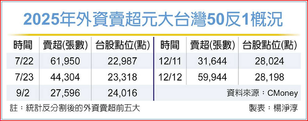 元大台灣50反1在去年12月以「七倍」進行反分割,讓ETF淨值回到22.82元的投資人熟悉區間,創台灣ETF史上首例。重新掛牌以來,外資在今年12月12日大賣5.99萬張、僅次於今年7月22日的6.19萬張,12月11日台股創歷史新高當日,外資賣超元大台灣50反1達3.23萬張,12日指數反彈時又進一步擴大賣超至5.99萬張,單日賣超量創下反分割以來次高紀錄,顯示外資空方部位遭到軋空、被迫回補。同一時間,元大台灣50反1的借券賣出餘額創下反分割以來新高,達10.50萬張。