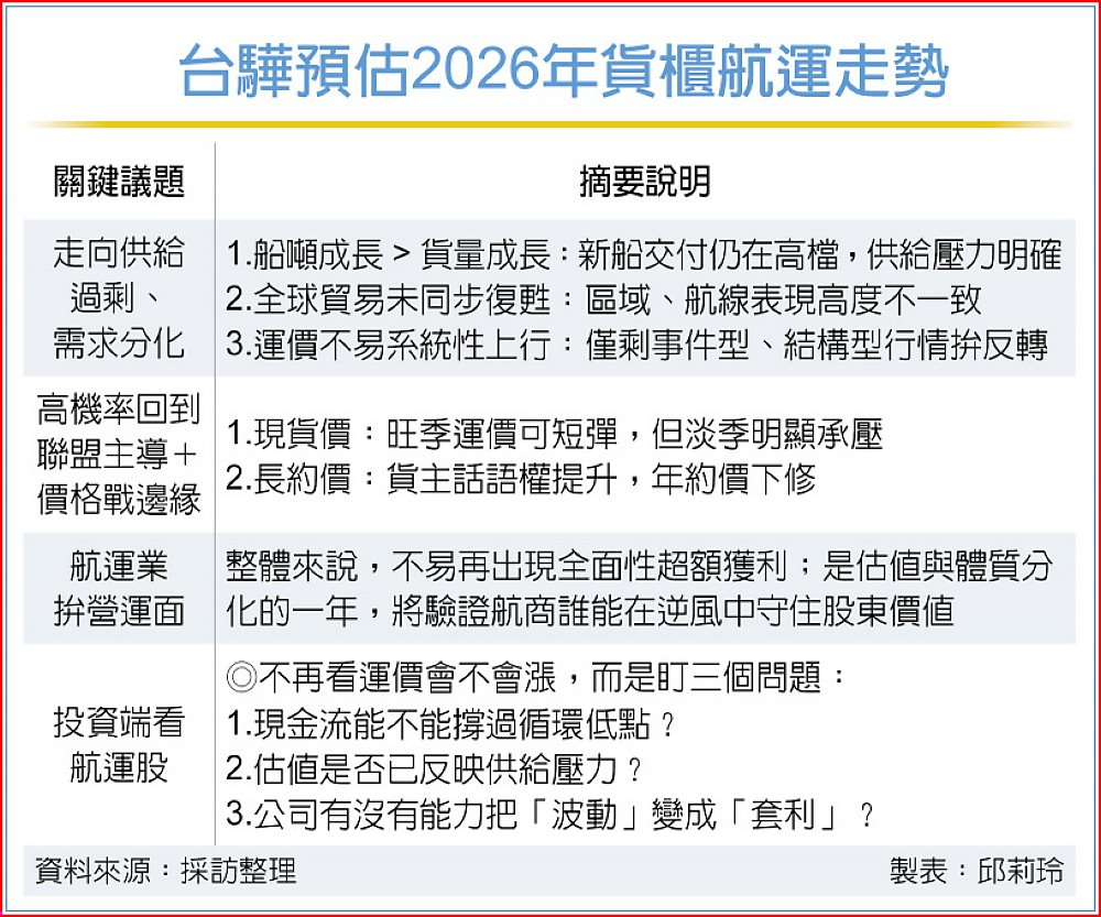 航運市場在2025年歷經關稅戰掀起的驚濤駭浪之後,台驊控股創辦人顏益財預估,2026年將走向「供給過剩、需求分化」的新循環週期,創紀錄的運力遠大於貨量增速,貨主話語權提升,年約價下修趨勢不變,現貨價可能僅在旺季短彈,但在淡季壓力加劇,運價戰一觸即發。