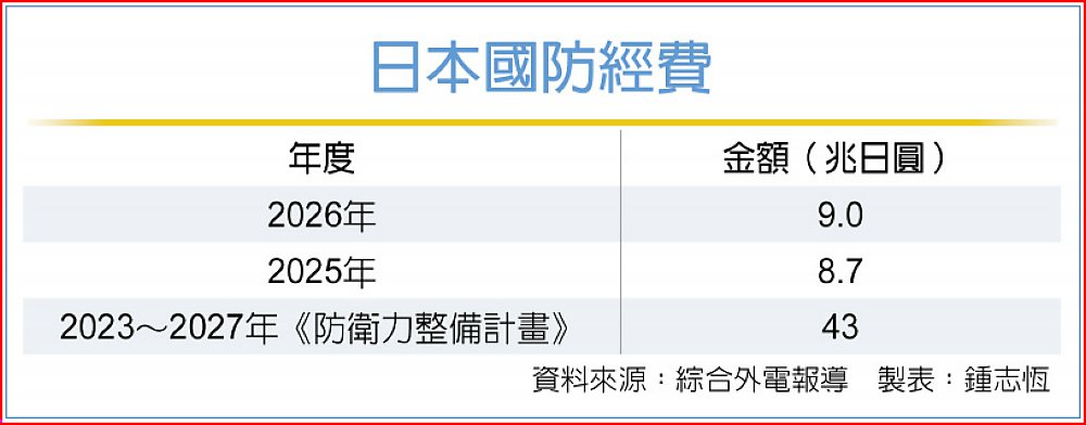 日本國防經費占國內生產毛額(GDP)比率,2024年度和2025年度均約1.4%,即使2026年度金額再創新高,若按日本銀行預測2026年度GDP成長0.7%,推算規模約635.6兆日圓,9兆日圓占GDP比率仍維持約1.4%。