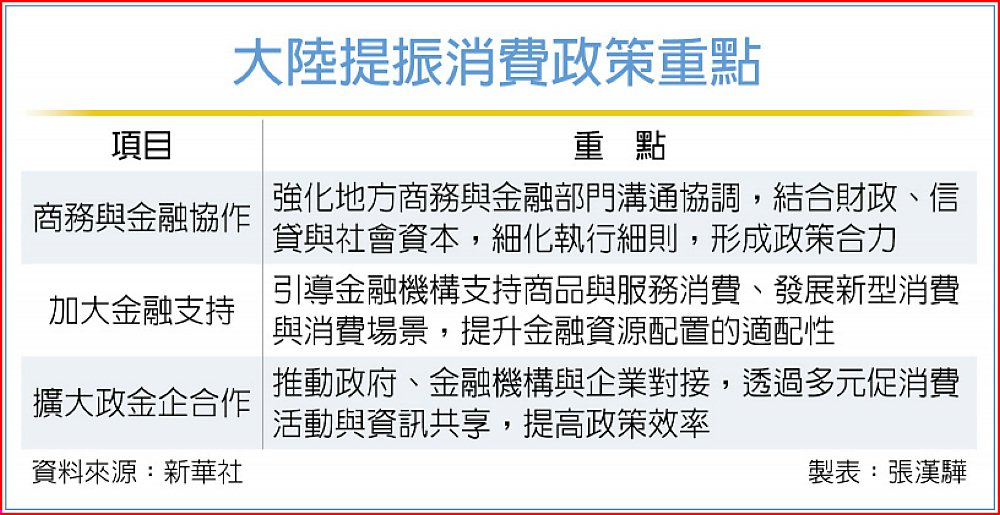 中共中央經濟工作會議提出明年經濟工作8項重點任務,提到要「深入實施提振消費專項行動」。大陸商務部、中國人民銀行與金監總局14日聯合公布「關於加強商務和金融協同,更大力度提振消費的通知」,內容聚焦引導金融機構加大對消費的支持力度,並協助擴大內需。