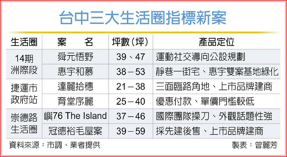 以台中14期「洲際段」為例,第四季最具代表性的「舜元悟野」與「惠宇和慕」等二大新案同時登場,其中舜元悟野鄰近洲際棒球場、漢神洲際購物中心與台中巨蛋,主打運動社交導向的公設規劃,吸引重視機能便利與社交氛圍的家庭客。