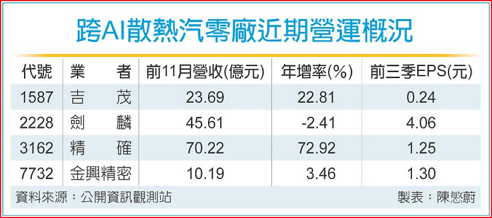 汽車零件廠跨足AI伺服器散熱領域,轉型效益於今年底陸續浮現,包括吉茂(1587)、劍麟(2228)、精確(3162)等廠,近期在AI水冷技術驗證與產線建置上皆傳捷報,預計年底前啟動小量產,2026年正式放量出貨。法人分析,隨著AI新事業進入收穫期,汽零廠明年業績驅動可期。