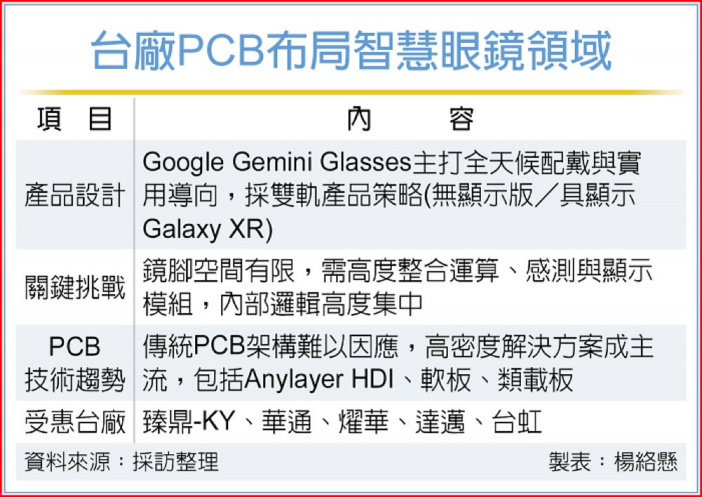 Google宣布將於2026年推出「Gemini Glasses」重返智慧眼鏡市場,以Android XR平台結合Gemini AI模型為核心,朝向全天候配戴與實用導向推進。隨新一代產品設計量產化,HDI(高密度互連板)與軟板架構成為關鍵支撐,台灣PCB供應鏈包括臻鼎-KY(4958)、華通(2313)、燿華(2367)等廠商已切入相關應用,布局路徑逐步浮現。