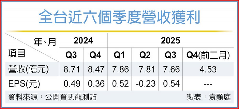 受大客戶新舊產品轉換,及第二季新台幣大幅升值影響,全台今年營收、獲利均下滑。累計前11月合併營收27.86億元,年減16.26%。獲利表現來看,由於醫療產品營收占比增至28%,毛利率守穩在23.65%,營業利益約1.56億元,年減27.78%,稅後純益約1.22億元,年減55.64%,每股稅後純益0.82元。
