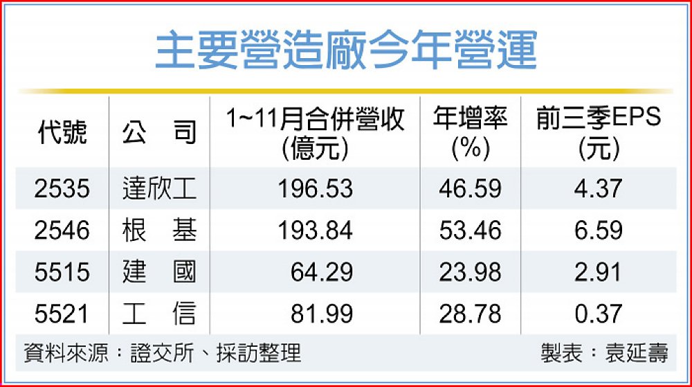 建國前三季稅後純益5.87億元、年增20.7%;市場預期,建國工程目前工程總承攬額714億元,未實現收入522億元,今年獲利將可望會有高兩位數的成長。