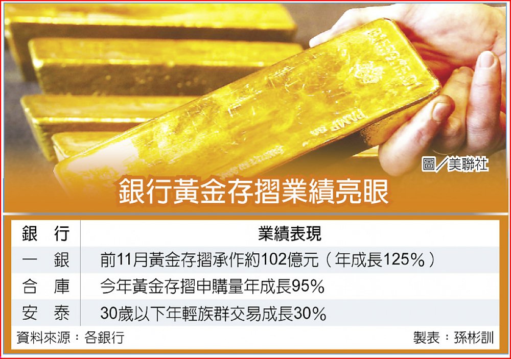 黃金價格今年表現亮眼,漲幅約6成,也讓銀行的黃金存摺業績大好。第一銀行統計,今年前11月黃金存摺承作金額約新台幣102億元、開戶數約7,800戶,與去年同期相比分別成長125%及142%。合庫銀行今年以來黃金存摺申購量較去年同期成長約95%,其他銀行也多有不錯成績。