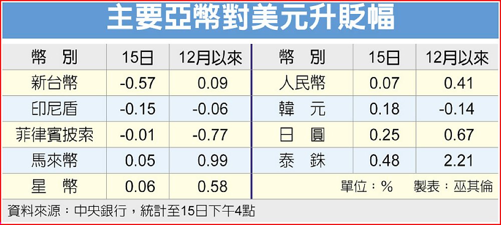 主要亞幣升多貶少,新台幣狂挫0.57%成最弱亞幣,其他馬來幣、星幣、人民幣、韓元、日圓各升值0.05%~0.48%