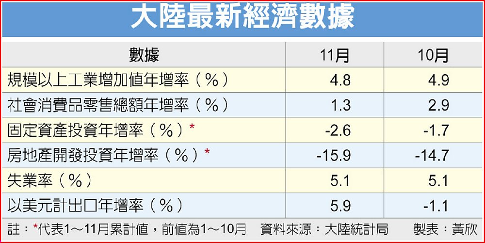 數據顯示,11月大陸全國規模以上工業增加值增4.8%,續創2024年8月以來最低,社會消費品零售總額年增1.3%,更創下2022年12月以來新低。此外,受房市低迷影響,投資增速持續下滑,前11個月固定資產投資年減2.6%,續創2020年6月以來的五年半新低。