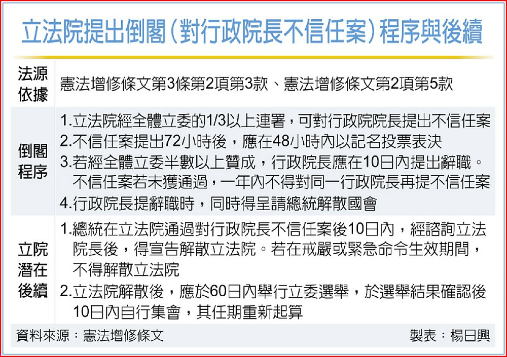 有藍委指出,是行政院不依法執行三讀法律,違背權力分立原則,不隨民進黨幼稚想法起舞,根本沒有想過倒閣。白委表示,綠營一而再、再而三創造對立衝突,稍早大罷免選輸後,又想要藉由倒閣、解散國會來重選,只想選到贏為止,這不是台灣人民期待的民主與政府。