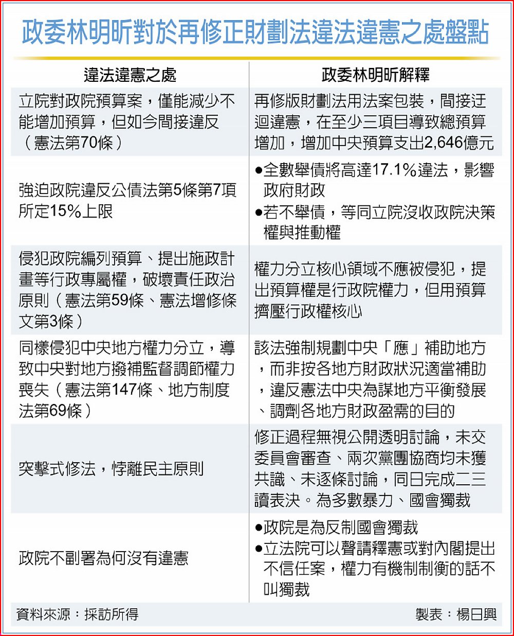 對立院再修版《財劃法》,行政院政務委員林明昕15日以《憲法》視角盤點,至少涉及五項違憲之處:增加行政院預算案、強迫政院舉債違法、水平侵犯編列預算與提施政計畫等行政權、垂直侵犯中央對地方撥補調節權力、悖離民主原則。