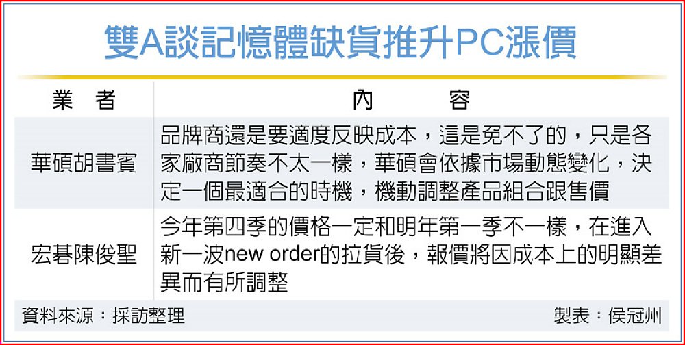 宏碁董事長暨執行長陳俊聖及華碩共同執行長胡書賓15日異口同聲指出,對於PC售價終要反映記憶體價格的飆漲,已是各家品牌廠的共識,PC成本上漲、報價拉升也已是「現在進行式」,明年上半年估仍不會緩解,而明年第二季的商用/消費端產品報價,目前因能見度低無法定案。