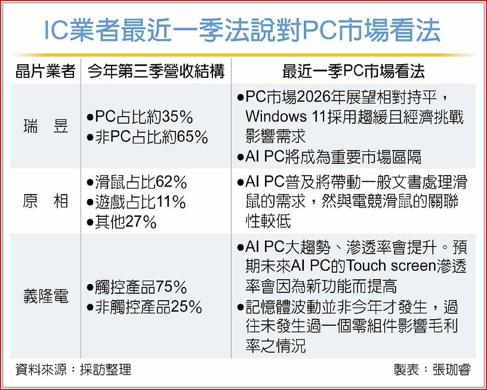 以台灣IC設計廠來看,瑞昱產品線橫跨網通、音訊與PC周邊,其中筆電相關IC約占營收35%,PC市場動能變化對其營運具高度影響;原相長期深耕滑鼠感測IC,滑鼠業務占比高達62%,與PC出貨連動性更高。法人分析,兩家公司目前訂單能見度尚穩,但若品牌廠對明年展望轉趨保守,拉貨節奏可能出現調整。