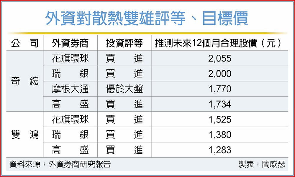 花旗環球證券指出,隨AI伺服器的熱設計功耗(TDP)持續攀升,散熱架構由氣冷加速轉向液冷,擴張散熱於每機櫃中內含價值,台系供應鏈中特別青睞奇鋐與雙鴻,初評同步給予「買進」投資評等,股價預期各為2,055元、1,525元,在AI供應鏈重挫環境中送暖。