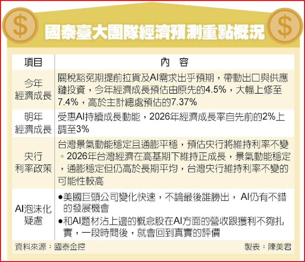 展望2026年,受惠AI持續成長動能,國泰臺大團隊調高台灣經濟成長率預估值,自先前的2%上調至3%,研判有80%的機率落在1.5%~4.5%。