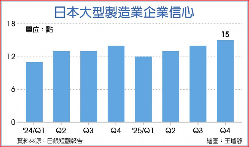 日本央行(日銀)15日公布短觀報告(Tankan)顯示,2025年第四季(10~12月)大型製造業企業信心從第三季的14升至15,連三季改善並創四年新高。顯示日企目前仍能承受美國關稅衝擊,也強化市場對日銀本周例會將升息的預期。