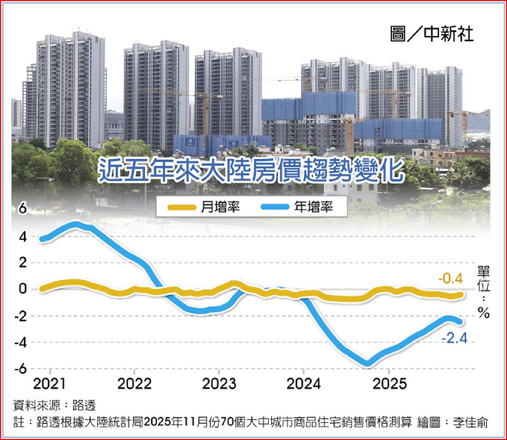 路透根據大陸統計局數據測算,11月新屋價格月減0.4%,雖較10月的0.5%跌幅略為收斂,但仍維持下行趨勢;按年計算,11月房價年減2.4%,高於10月的2.2%,創近三個月來最大跌幅。