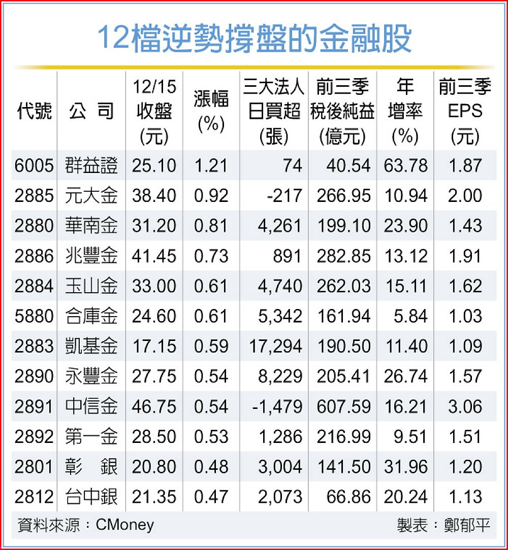 美股AI泡沫疑雲再度升溫,台股15日也震盪走跌,惟在電子股熄火之際,金融族群站出霸氣撐盤,專家指出,上市13家金控今年前11月大賺5,604億元,全年獲利展望佳,也為2026年配息能力增添想像空間,催出市場「愛息」買盤,帶動上市金融類股指數連三漲,創逾35年來新高,元大金(2885)、華南金(2880)、中信金(2891)等多檔逆勢走揚。