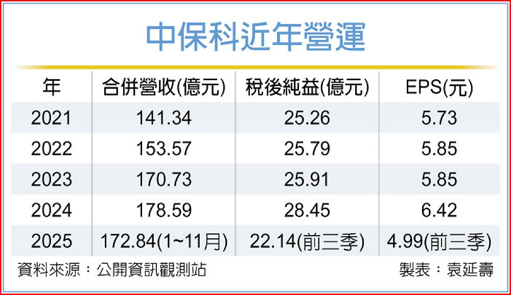 中保科今年前11月合併營收172.84億元,年增7.09%;前三季財報更顯示,營業毛利率、營業利益率「雙率雙升」,前三季稅後純益22.14億元、年增為3.7%,每股稅後純益(EPS)達4.99元,幾乎已經賺進半個股本。