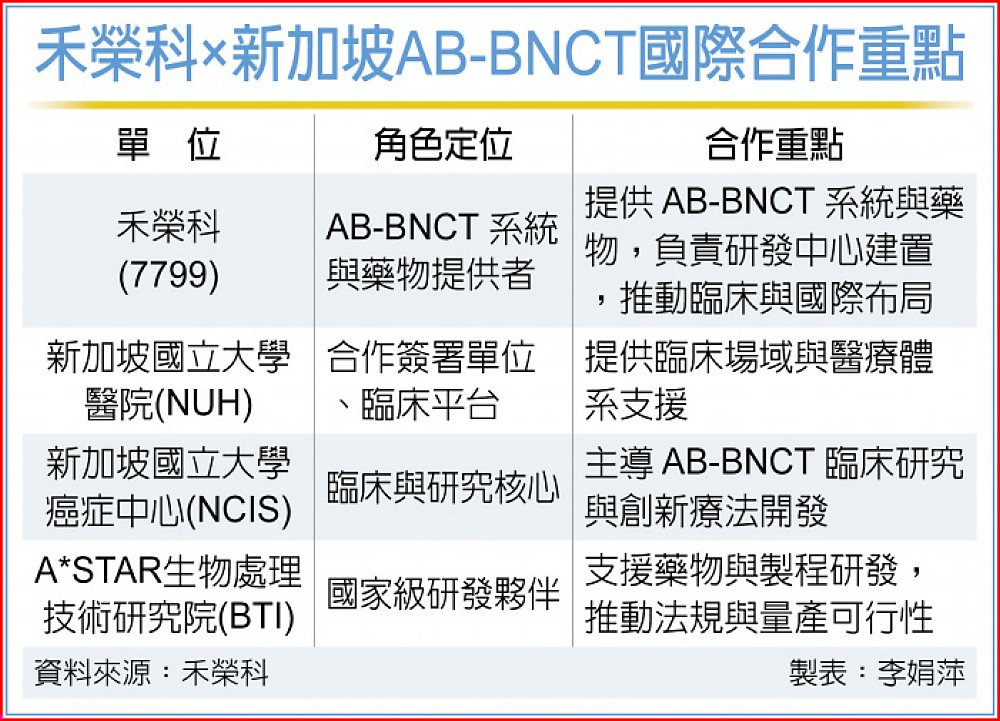 禾榮科(7799)15日宣布,已與新加坡國立大學醫院(National University Hospital,NUH)及新加坡科技研究局(A*STAR)旗下生物處理技術研究院(Bioprocessing Technology Institute,BTI)簽署合作協議,三方將於新加坡共同建置「東南亞首座加速器型硼中子捕獲治療(AB-BNCT)研發中心」,推動創新癌症療法的臨床應用與國際合作。