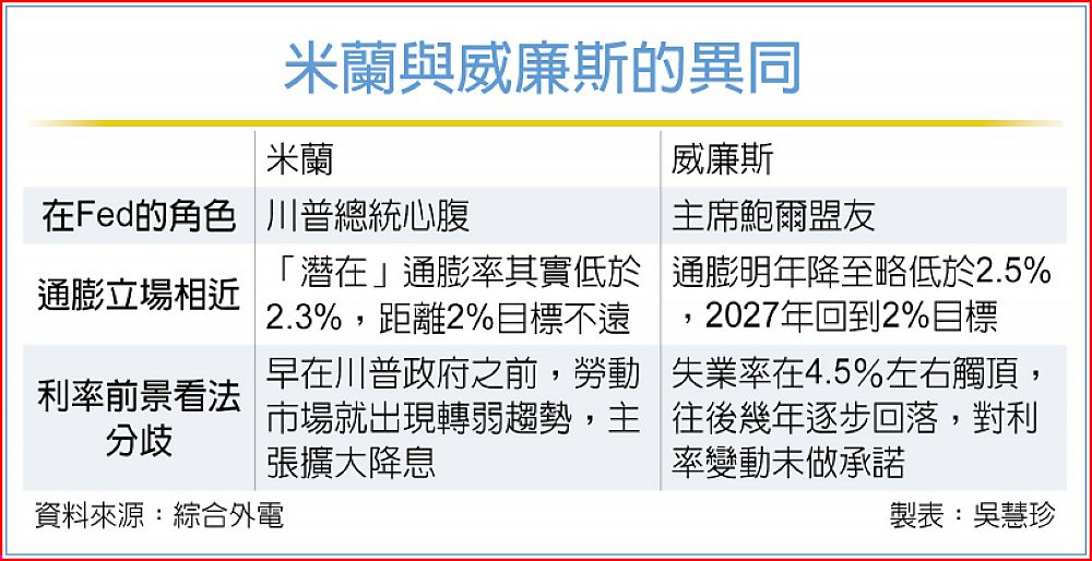 威廉斯是鮑爾的親密盟友,也是Fed意識形態核心。米蘭被視為民粹色彩較濃的體制外人物,是美國總統川普倚重的顧問,川普今年9月將其安插到聯準會填補理事庫格勒(Adriana Kugler)請辭後的空缺。