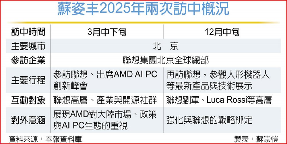 隨著美國政府批准晶片巨擘超微(AMD)向中國出口「特供版」AI晶片MI308,AMD執行長蘇姿丰16日火速抵達北京,親率高層團隊造訪聯想集團全球總部。市場分析,此行旨在鞏固關鍵合作夥伴,搶攻中國龐大的AI算力市場。