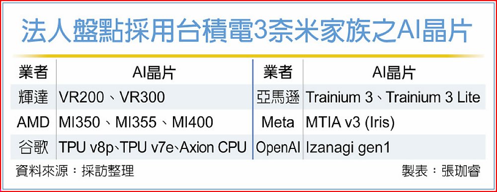 2026年多數高階AI晶片將全面導入3奈米或其強化版本,盤點如輝達VR系列、AWS Trainium 3、Google TPU等。