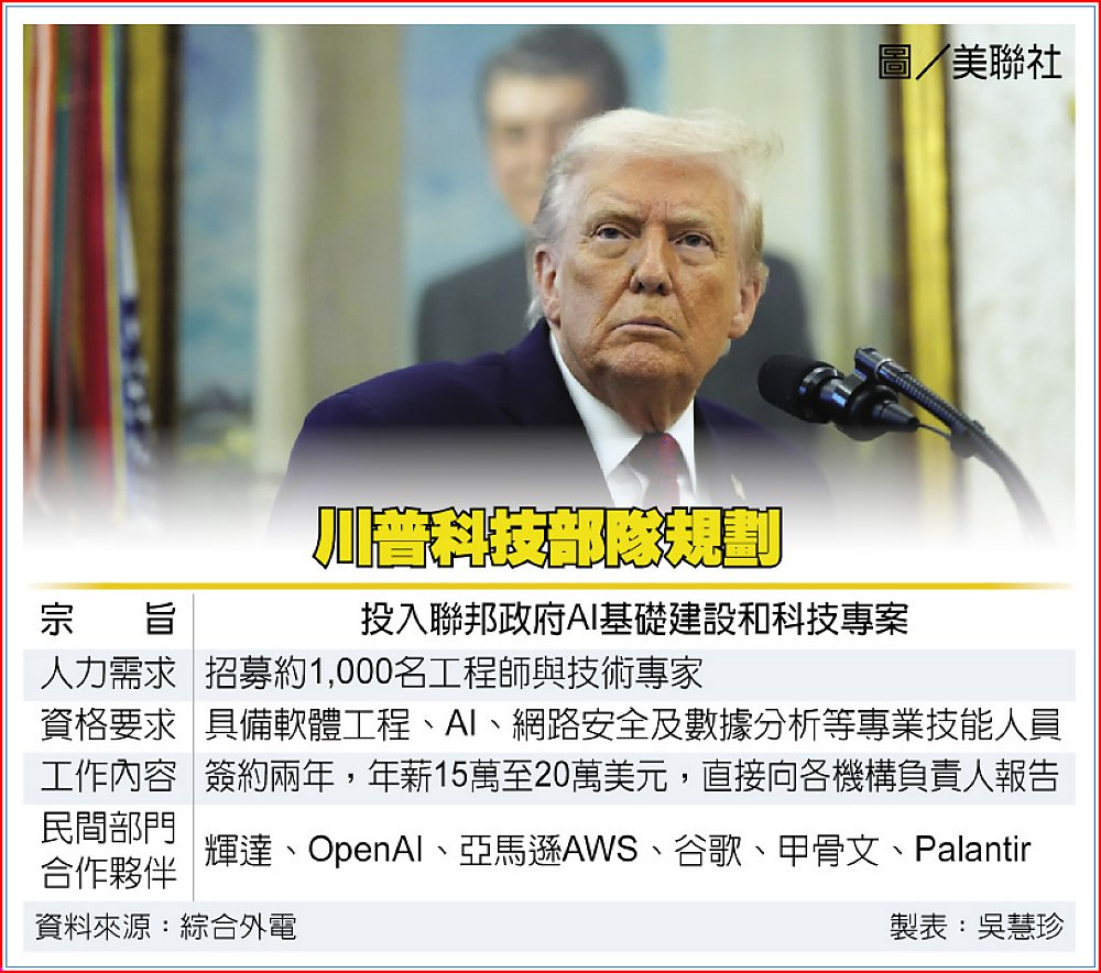 川普政府15日宣布打造「美國科技部隊」,招募約1,000名工程師與技術專家,投入聯邦政府AI基建和科技專案。