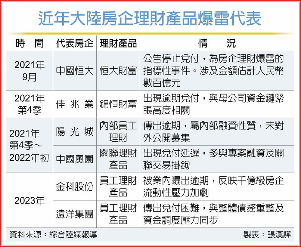 2021年9月,中國恒大旗下恒大財富公告停止兌付,揭開房企理財產品爆雷序幕。其後,佳兆業所屬錦恒財富、陽光城員工理財,以及中國奧園關聯理財產品,於2021年第四季至2022年初陸續逾期。隨著產業景氣轉弱,風險擴散至更多千億級房企,2023年市場再傳金科股份、遠洋集團等員工理財兌付延遲,顯示房企資金壓力仍在延燒。
